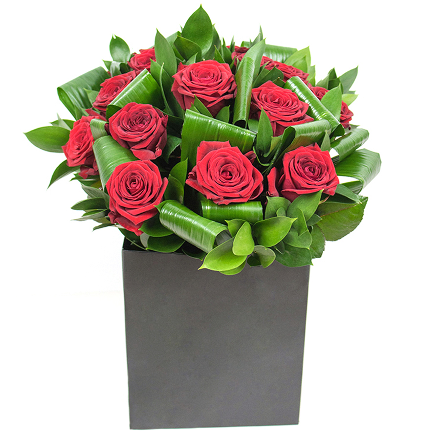 This stunning bouquet is a celebration of beauty and sophistication. Featuring luscious red roses, graceful aspidistra leaves, and artfully arranged ruscus, it is a truly luxurious treat for the senses. Each element is carefully hand-selected to ensure that only the freshest and highest quality flowers grace your home or event.